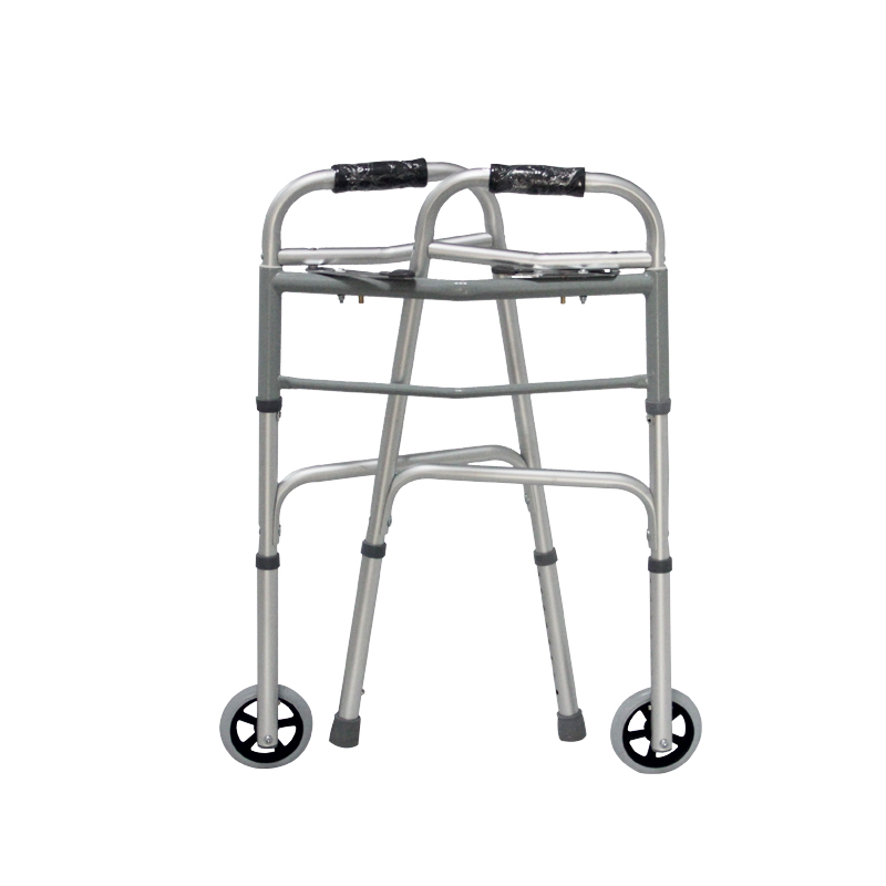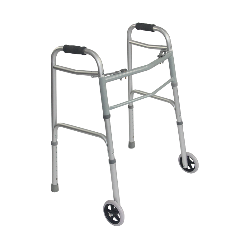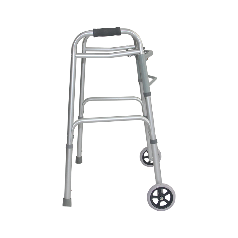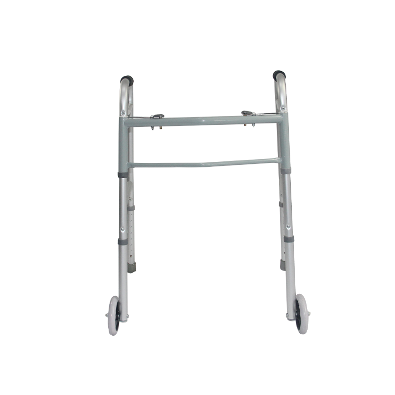 This is an aluminum walker with a matt silver frame. Its foldable design allows easy storage and portability. The product dimensions are 49.5cm (L) × 64.5cm (W) × 79-97cm (H), with adjustable height to suit users of different statures. It features two 5-inch front wheels for smooth movement and anti-skid rubber tips at the rear, ensuring stability and safety during use. Weighing only 2.8kg, it’s lightweight and easy to maneuver. With a weight capacity of 100kg, this walker is both durable and practical, ideal for aiding mobility in daily life.