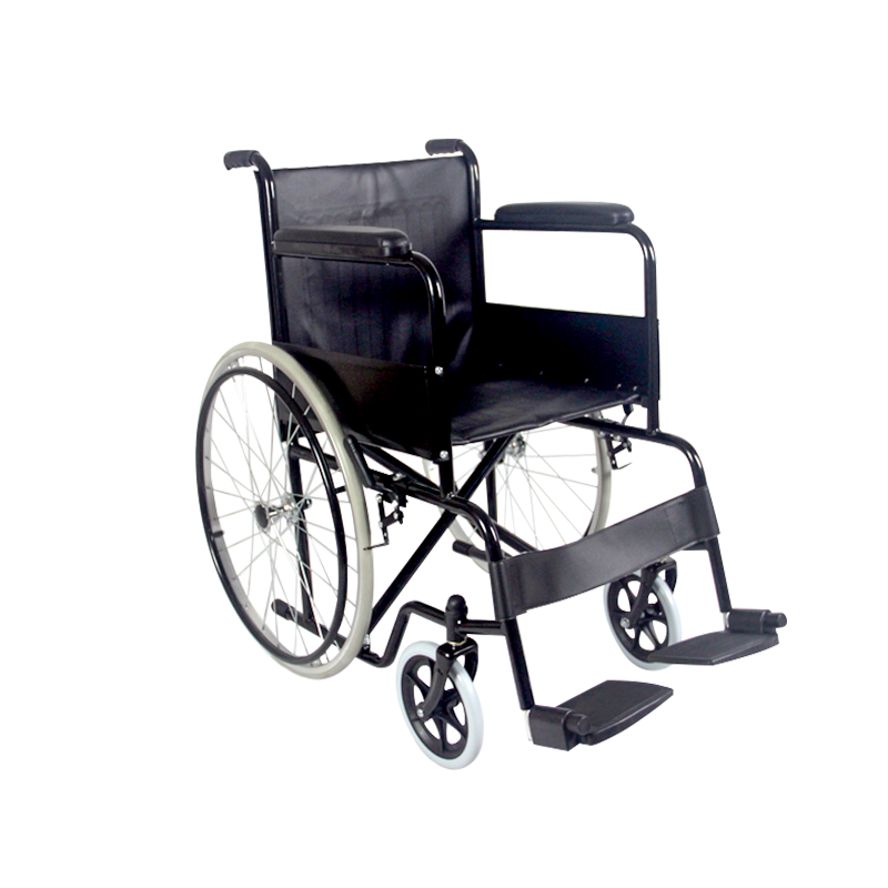 The powder-coated steel frame wheelchair features a durable, rust-resistant design. It offers seat widths of 16" or 18" to accommodate different users. The fixed PVC armrests and footrests provide stability, while the black steel side panels add structural integrity. The 8" solid front castors and 24" spoke rear wheels with solid tires ensure a smooth, maintenance-free ride on various surfaces. The plastic pushing hand rim allows for easy manual propulsion, and the plastic footplate offers solid foot support. Additionally, the PVC black cushion enhances comfort during extended use. With a weight capacity of 100 kg, this wheelchair is practical for daily mobility needs.
